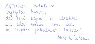 Hvala Agenciji Gala, predvsem Vama Mojca in Jože, da sta bila tako dobra prijatelja in sopotnika na poti iskanja ljubezni in sreče, kajti moje življenje bi bilo popolnoma drugačno, če vaju ne bi spoznala in Sonce nikoli ne bi brez vajine pomoči vzšlo. Ta čas prebit z vama, je bil zame posebno in nepozabno obdobje mojega življenja. Iskrena zahvala od zaljubljenega para, da sta naju združila, vidva in gospa usoda.