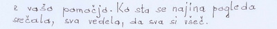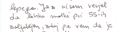 vljudno se zahvaljujem za Vaše prijazno pismo. Sporočam Vam, da v dvoje preživljava kar nekaj časa, dnevno sva večkrat na liniji, skupaj pohajava po naravi, po hribih, v soboto greva na celodnevni potep k morju in nato po Krasu, skupaj bova šla na koncert v Cankarjev dom v Ljubljano,.... skratka, mladi bi rekli, ''da se nama dogaja''.